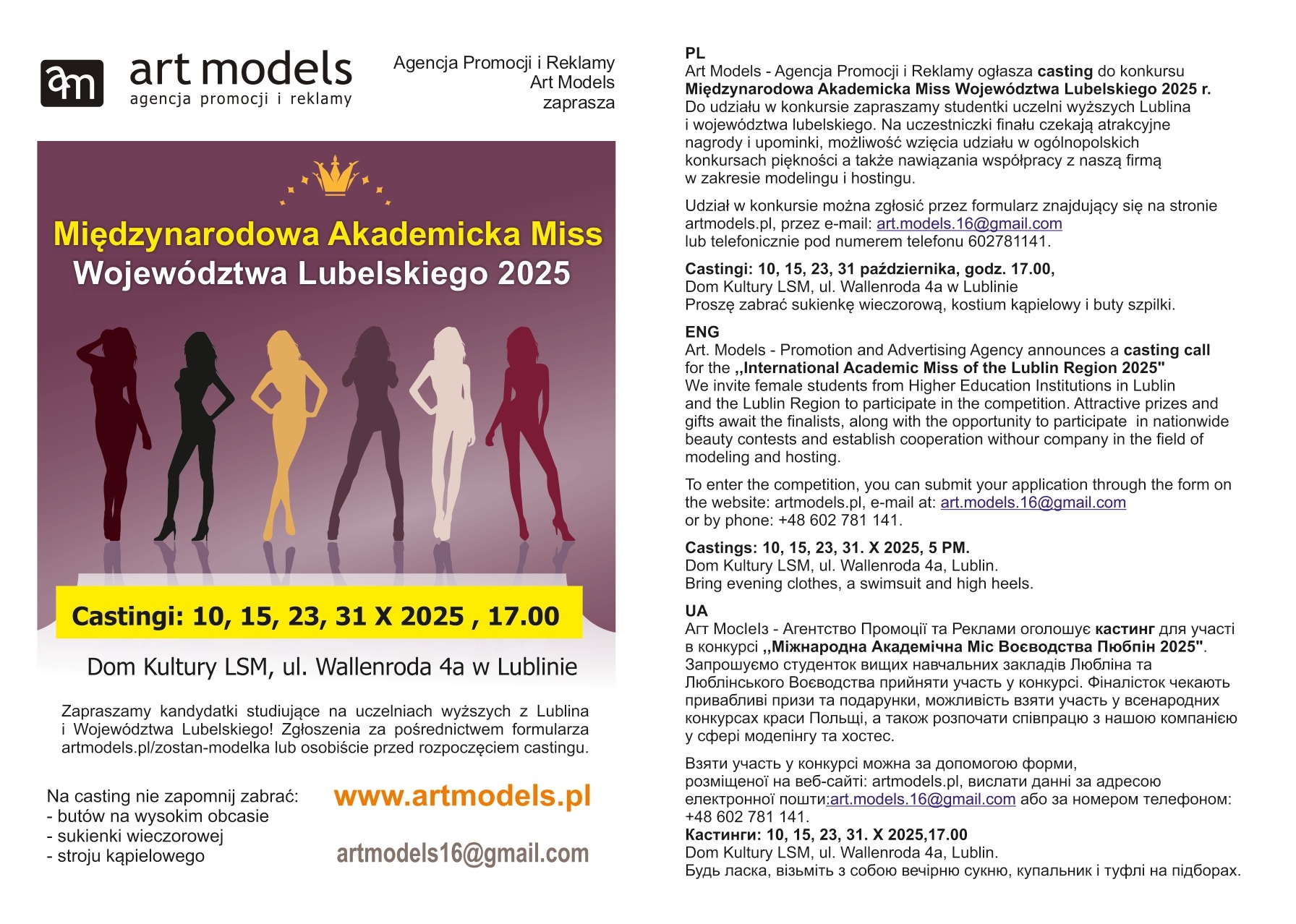 Агенція з просування та реклами Art Models оголошує кастинг на конкурс Міжнародна Міс Студенток Люблінського воєводства 2025 року.