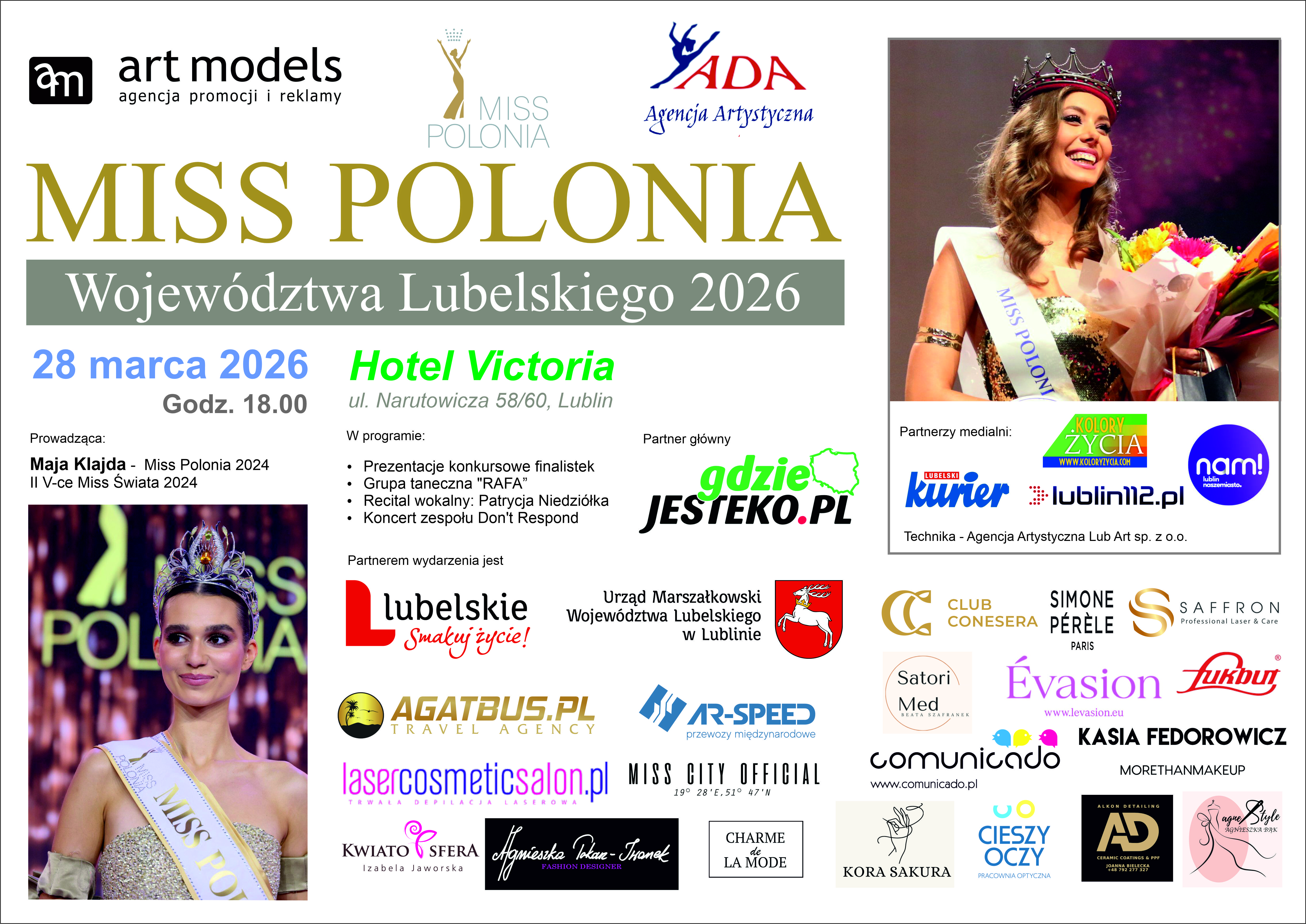 Miss Polonia Województwa Lubelskiego 2026 https://artmodels.pl/miss-polonia-wojewodztwa-lubelskiego-2026/ Thu, 11 Dec 2025 18:51:42 +0000 https://artmodels.pl/?p=7918 Maja Klajda Miss Polonia 2024 i Agencja Promocji i Reklamy Art Models licencjonowany organizator konkursu Miss Polonia w Województwie Lubelskim zapraszają do wzięcia udziału w castingu do finału regionalnego konkursu Miss Polonia Województwa Lubelskiego 2026, który odbędzie się 28 marca 2026r.